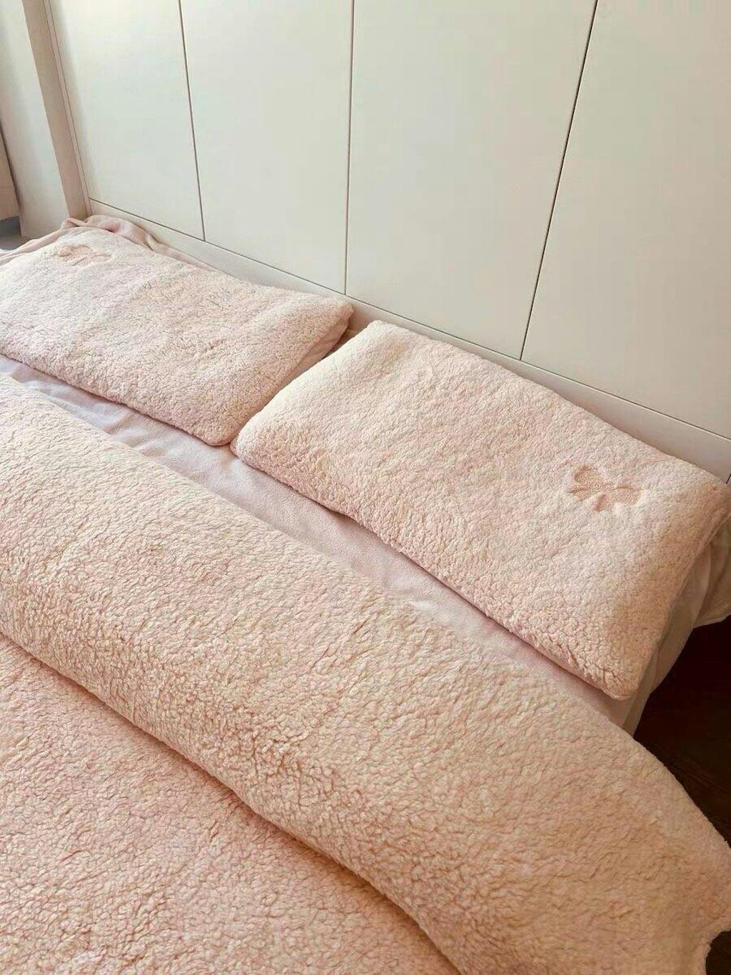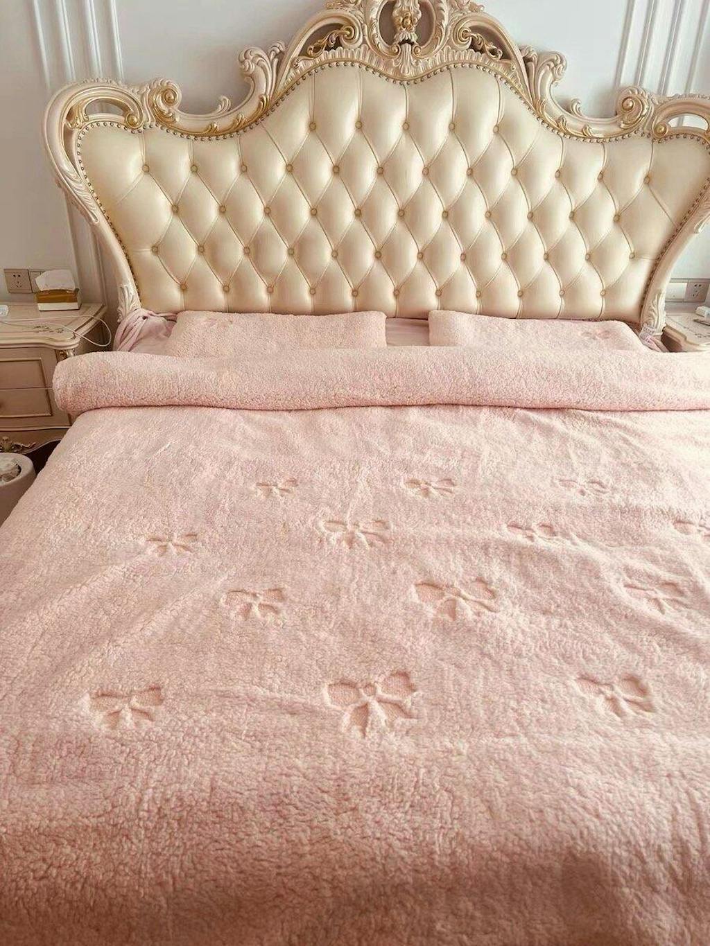 Plush sherpa bedding set with an all-over bow embroidered pattern. Soft, warm, and available in cream, pastel blue, and blush pink colorways.