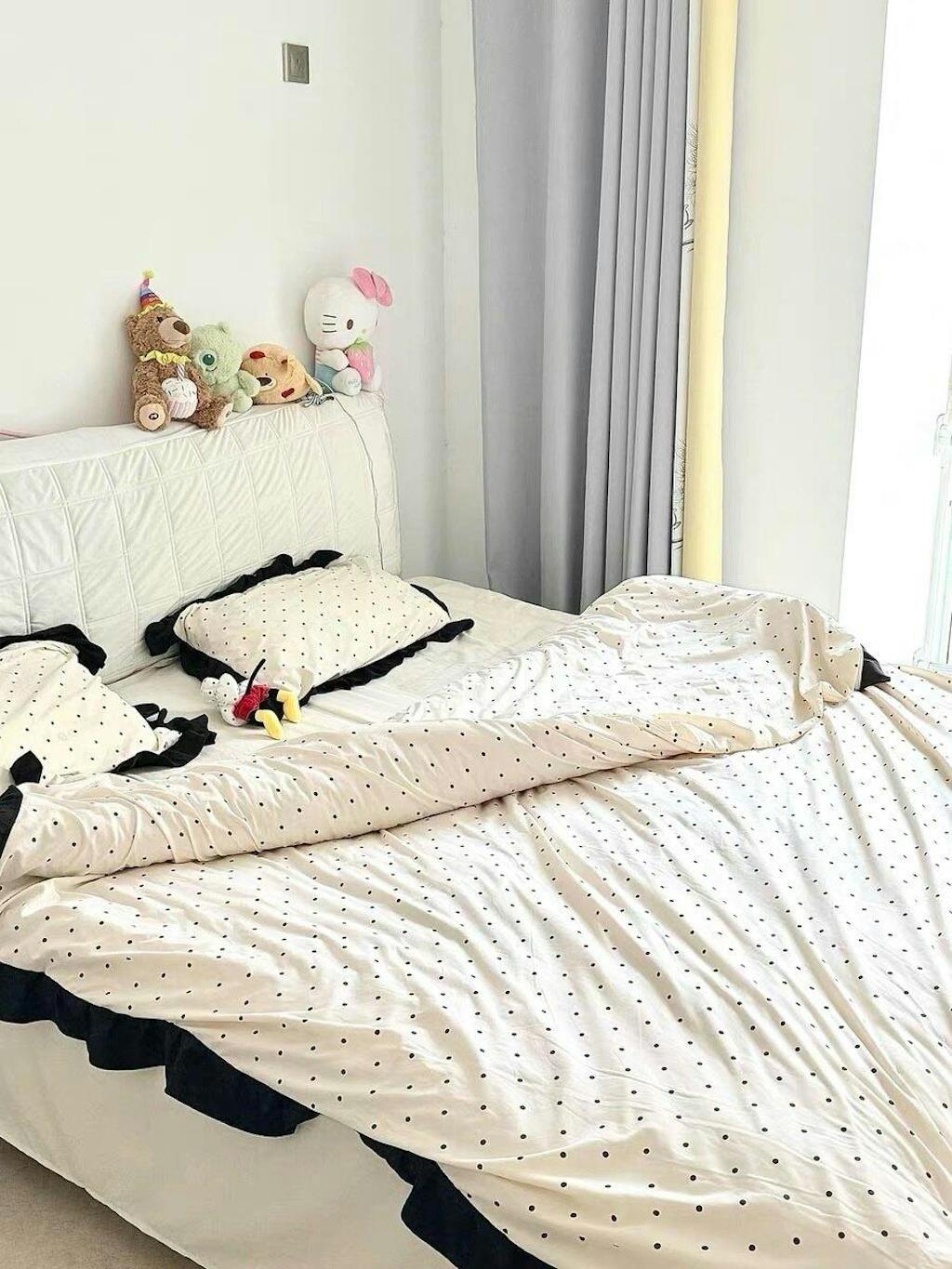 Elevate your bedroom with this polka dot bedding set inspired by French interiors. With its cream base, bold black dots, and delicate ruffle edging, it’s minimal yet full of personality