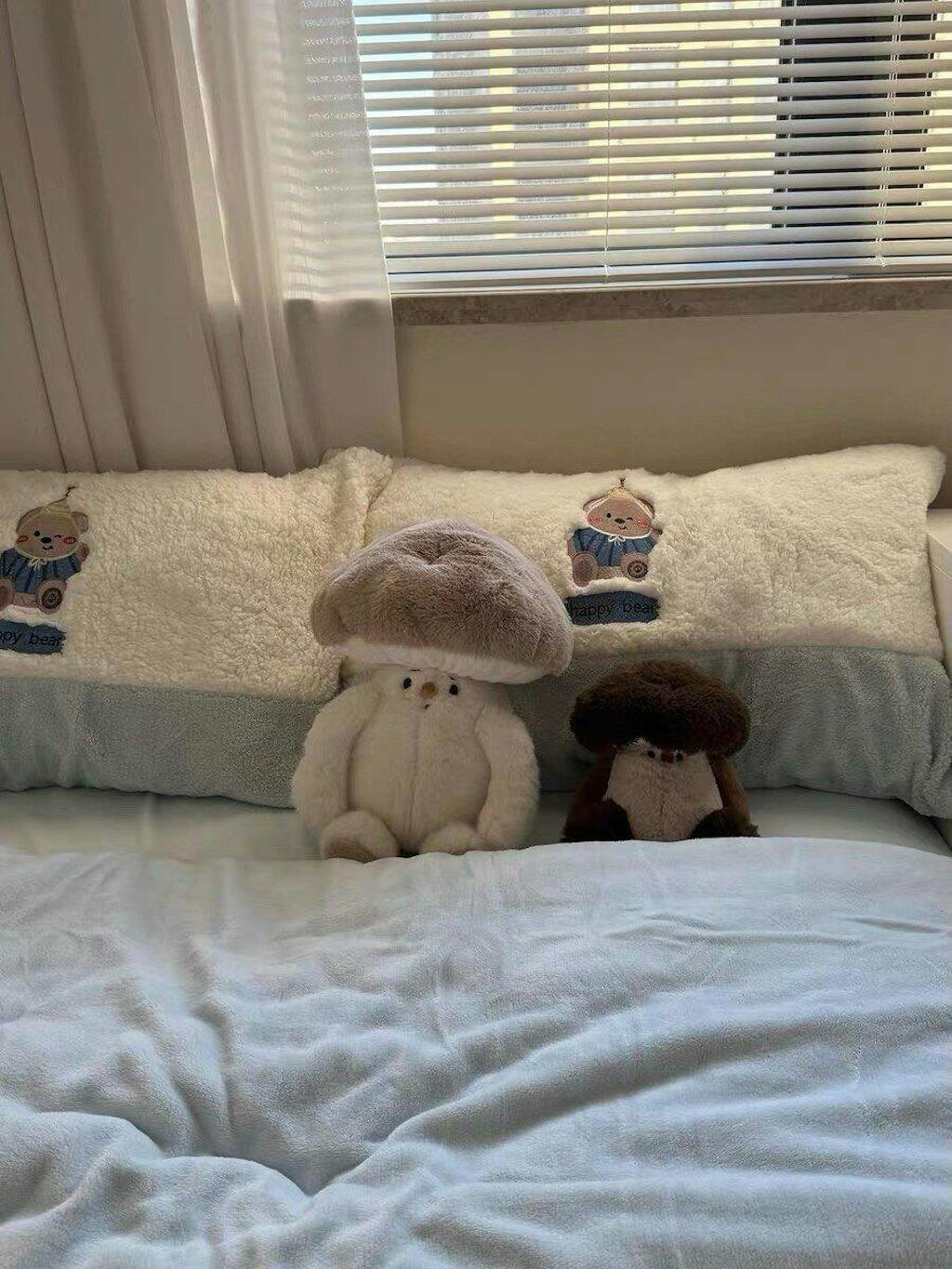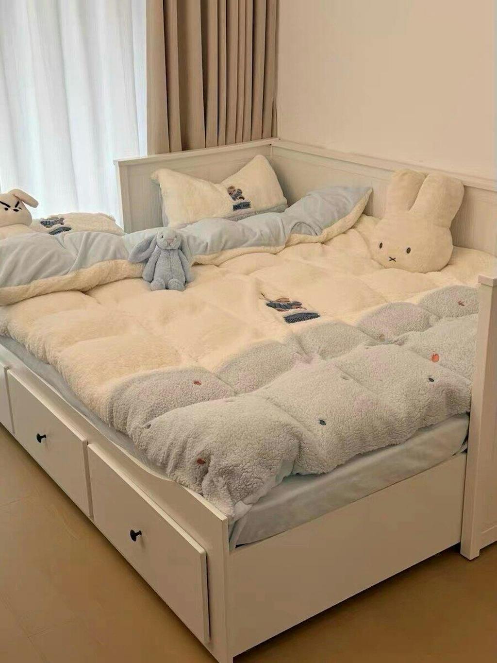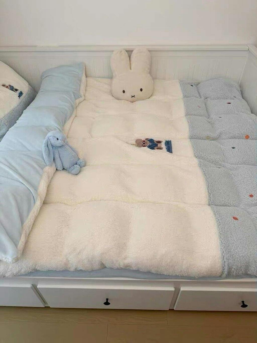 Happy bear fluffy sherpa kawaii pastel blue and white bedding set with embroidered bears and colorful polka dots.