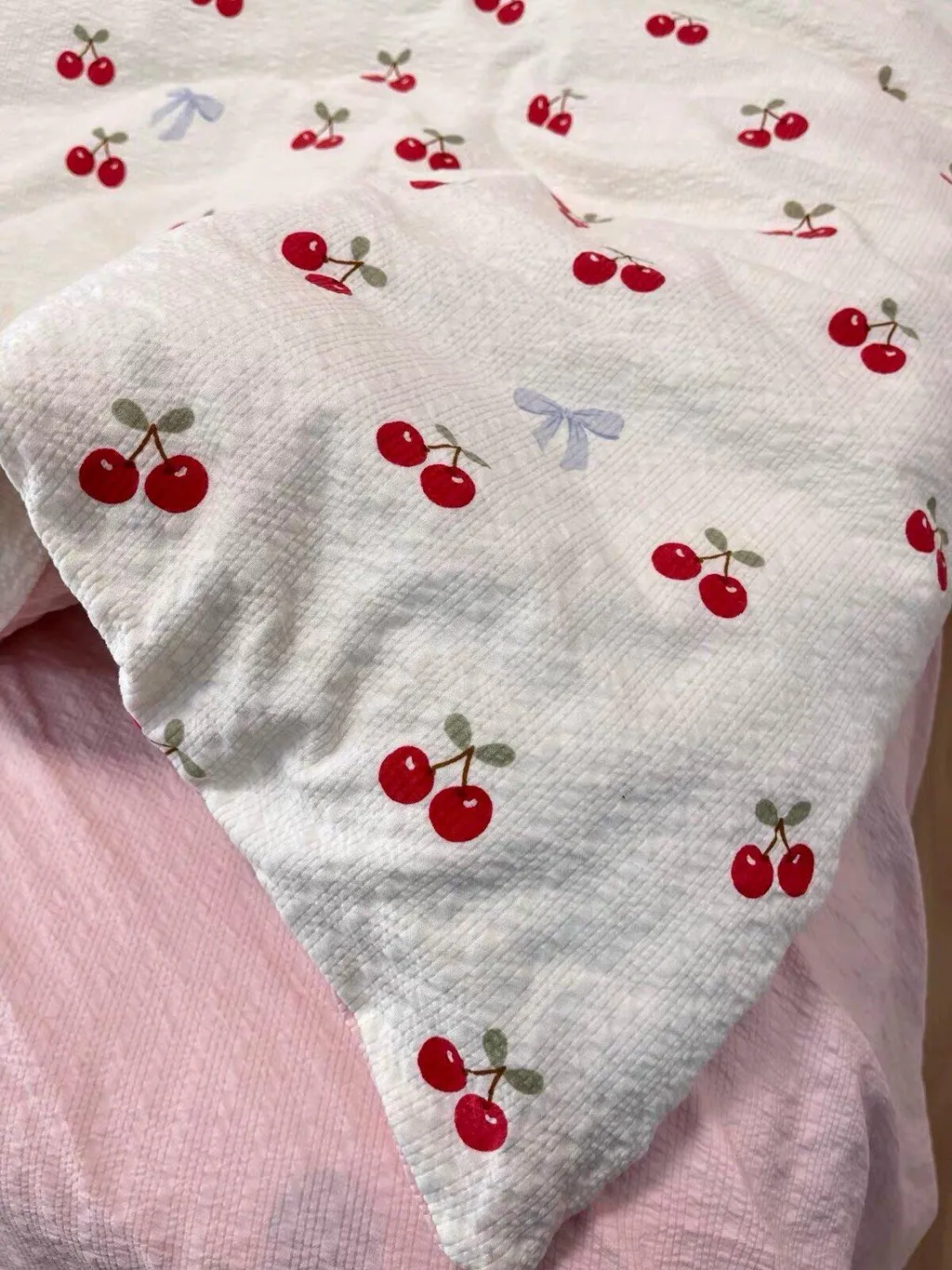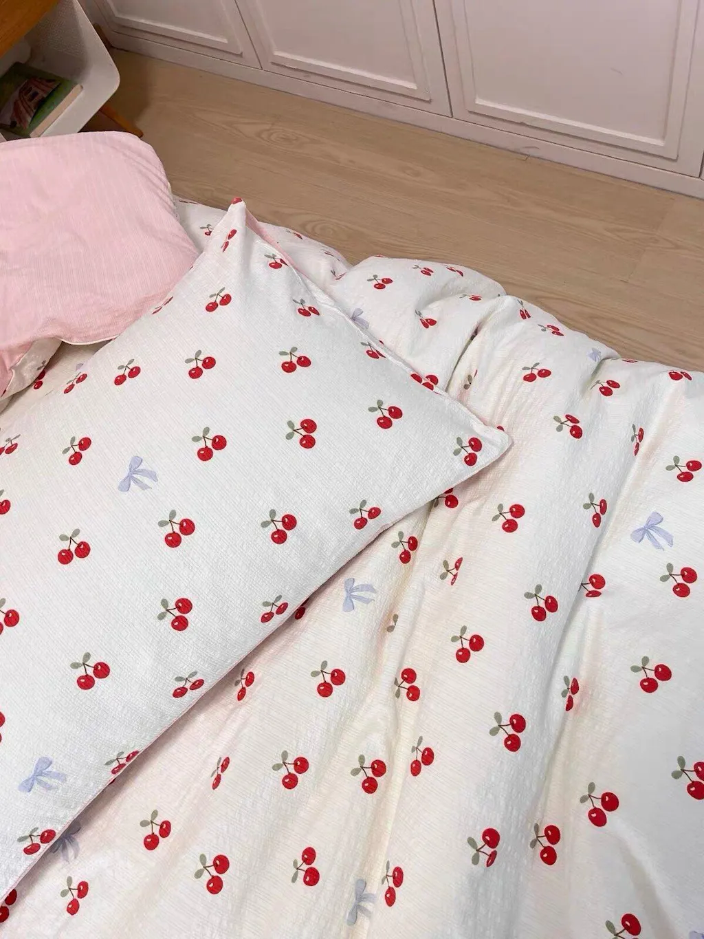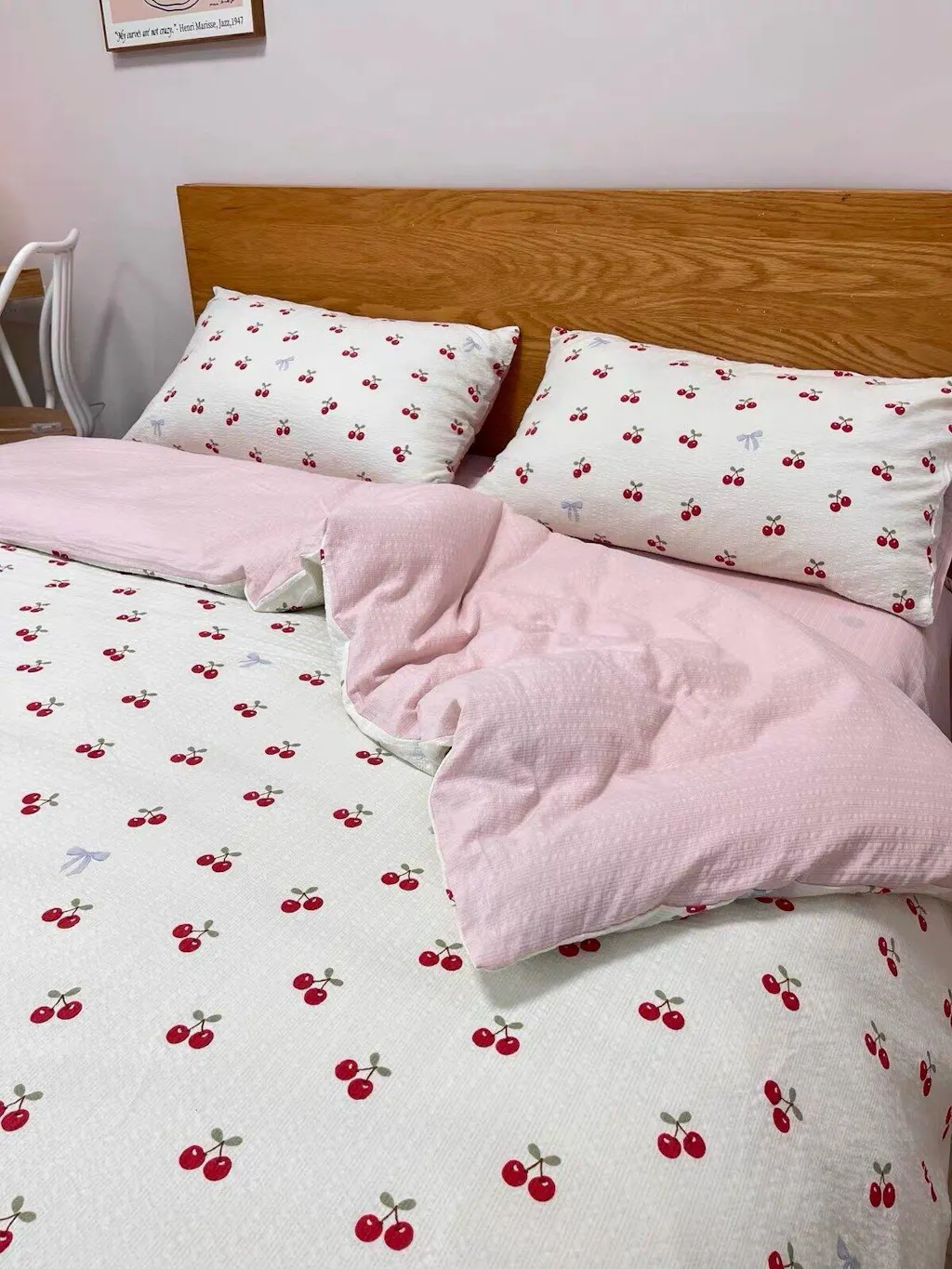 - Colors shown: Cream cherry duvet cover, cream cherry pillowcases, blush pink fitted sheet