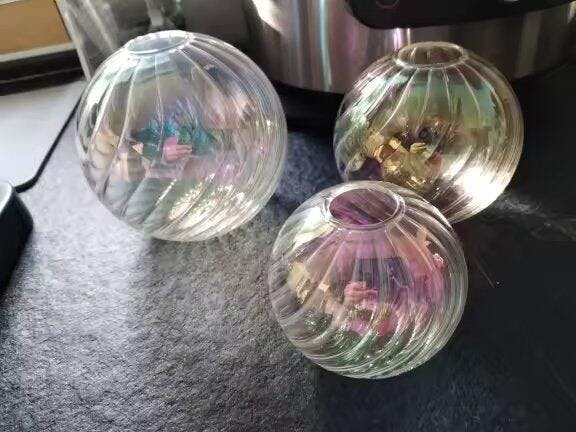 Soft pastel handmade twisted (spiral) glass bubble vase set to make your danish pastel shelves outstanding. Iridescent rainbow glow glass finish. Three different sizes pack. This ball wase can be used with artificial flowers, dries and decor or filled with water for fresh flowers. Hand-blown glass means precise and smooth shapes.