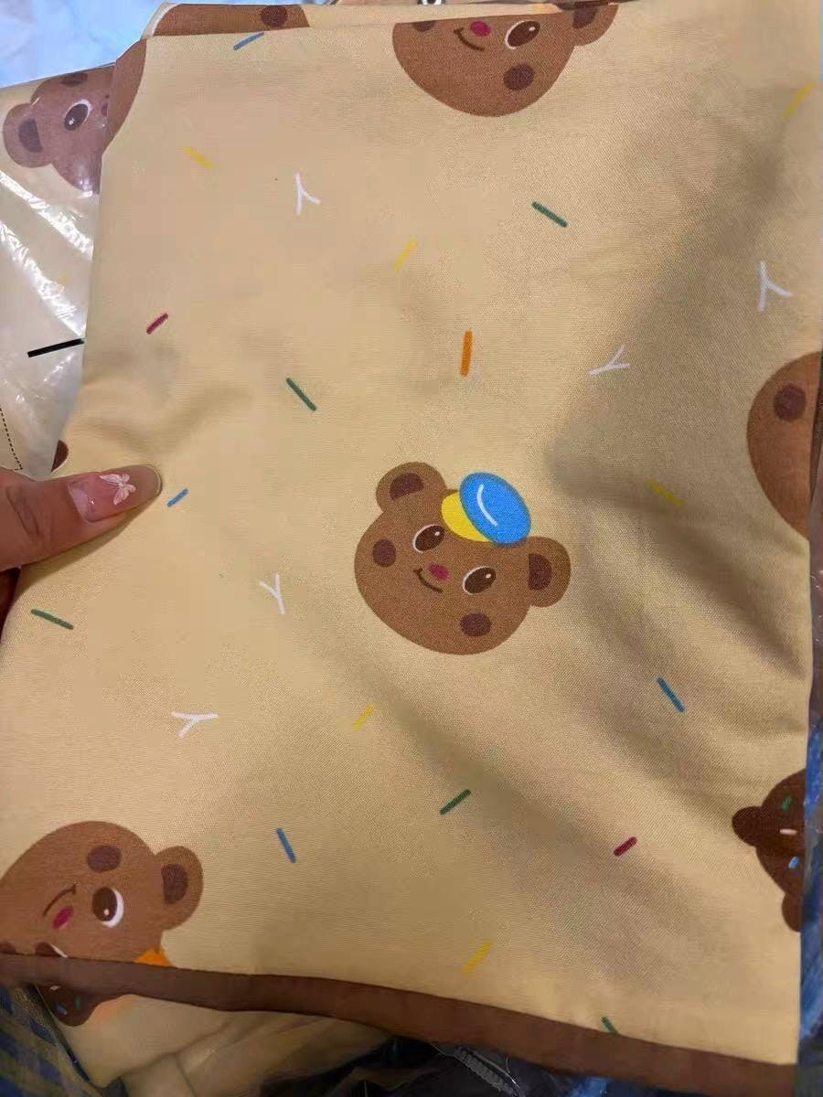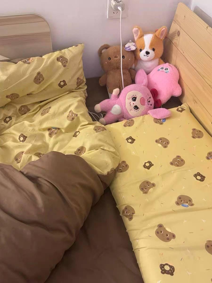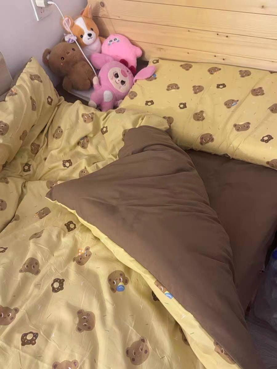 Beige and brown color bedding set with kawaii happy bears pattern print.