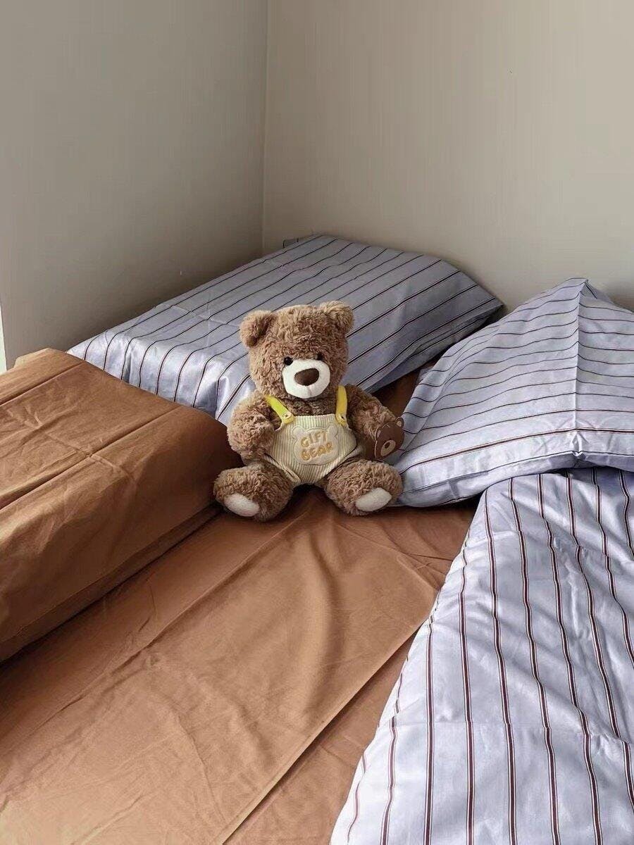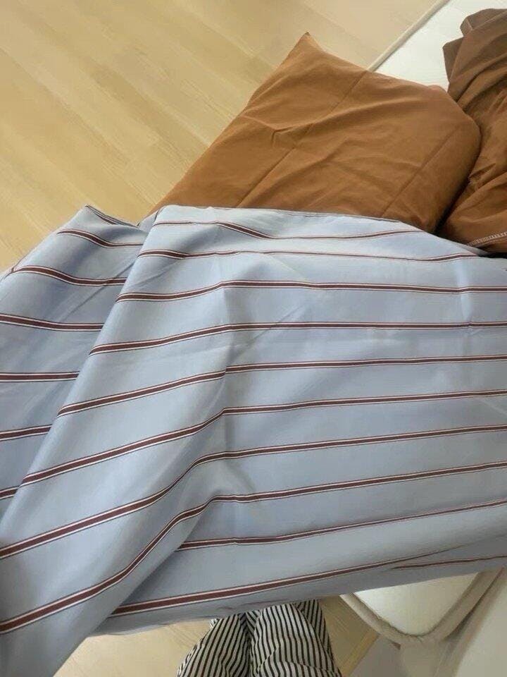 This bedding set brings a calm, modern look with its soft slate blue base accented by thin, evenly spaced pinstripes in a subtle brown tone. The pattern adds a tailored, understated elegance without being overly formal. Paired with warm terracotta brown fitted sheets and pillowcases, the contrast creates a refined atmosphere. The smooth cotton blend fabric ensures comfort and breathability, making it perfect for both everyday use and layering through the seasons.