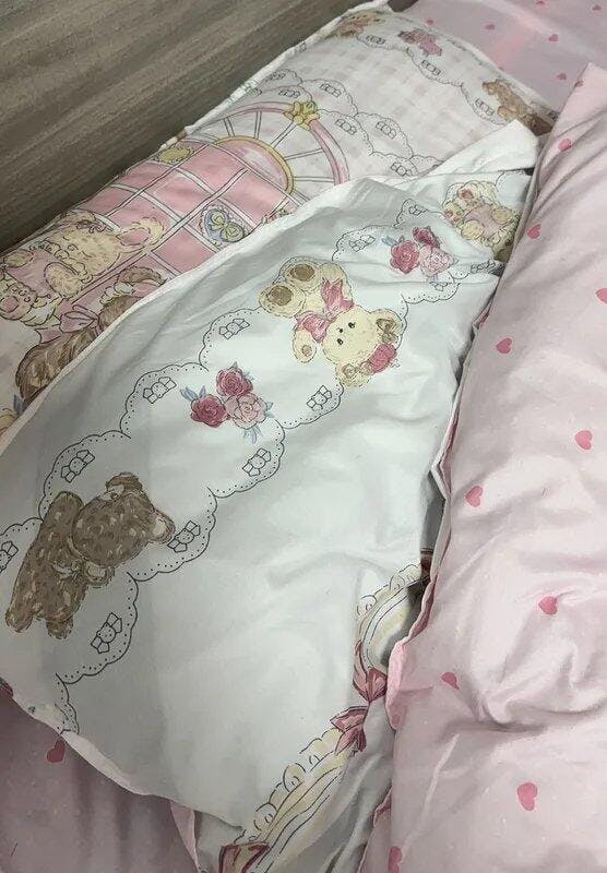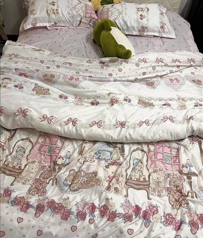 This charming bedding set is adorned with delicate illustrations of teddy bears lounging in a vintage parlor, surrounded by ruffled curtains, rose garlands, teacups, and heart motifs. It feels like something from a dollhouse fantasy thanks to the delicate pastel color scheme of cream, blush pink, and subtle blue. It's the ideal way to transform your bed into a comfortable scene from a storybook when paired with matching pillowcases and a fitted sheet with pink hearts on it.
