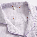 Stay cozy in this long-sleeve pastel purple pajama set, made from soft, breathable cotton. The top has a relaxed fit with pastel-colored buttons, a little chest pocket, and light contrasting trim on the collar and cuffs. The matching pants have an easy elastic waistband and fall to the ankle for full coverage. The crinkled cotton texture gives it a comfy, lived-in feel that’s perfect for cooler nights or lounging around the house.