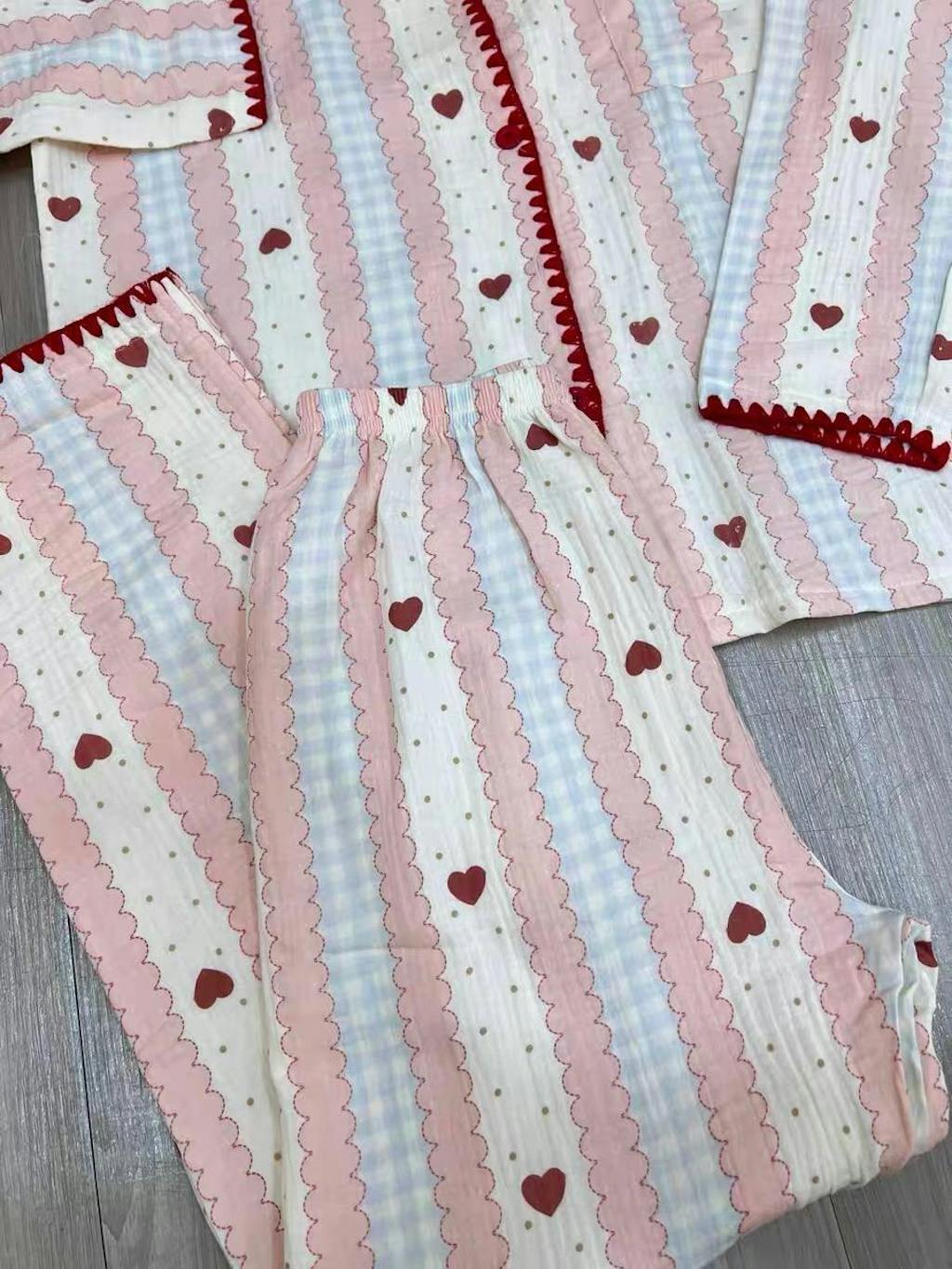 Long-sleeve pajama set, crafted from soft, breathable cotton. Red-stitched edge and red hearts print.