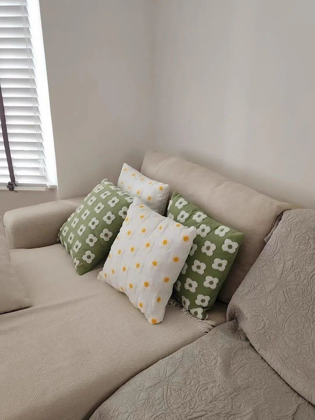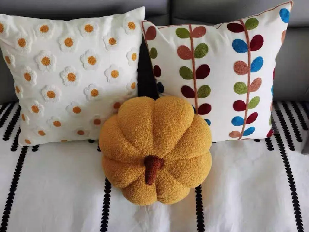 Bright embroidered collection of aesthetic pillow covers with little daisy flowers embroidered all over the topside of decorative cushion cover. Made of dense thick cotton canvas. Perfect for boho or danish pastel aesthetic room decor.
