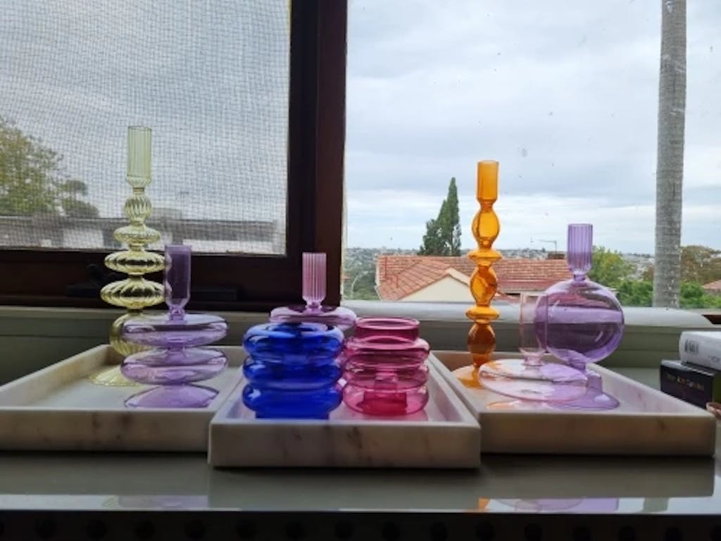Bright and colorful multipurpose bubble glass candle holders. Can be used as taper or tealight candle holder. Perfect for decorating modern/danish pastel aesthetic room.