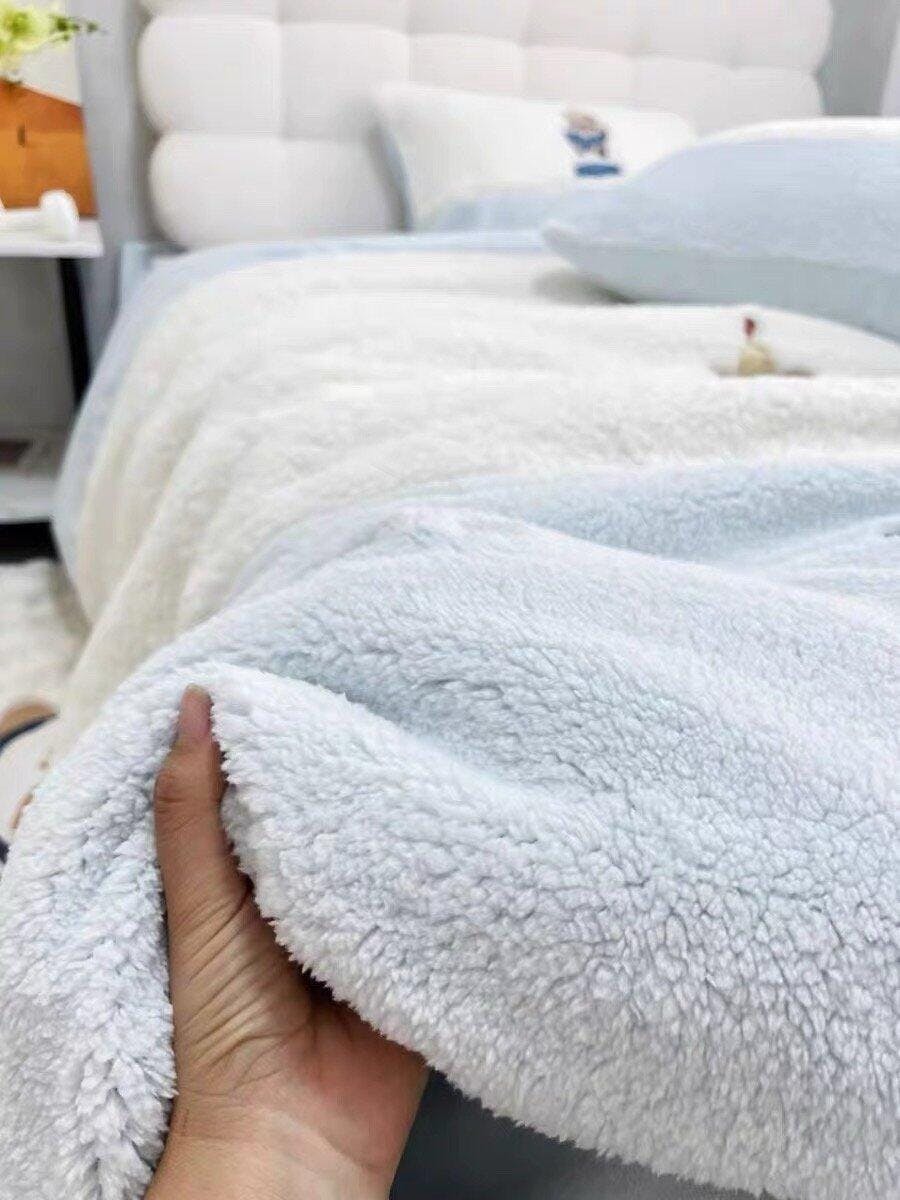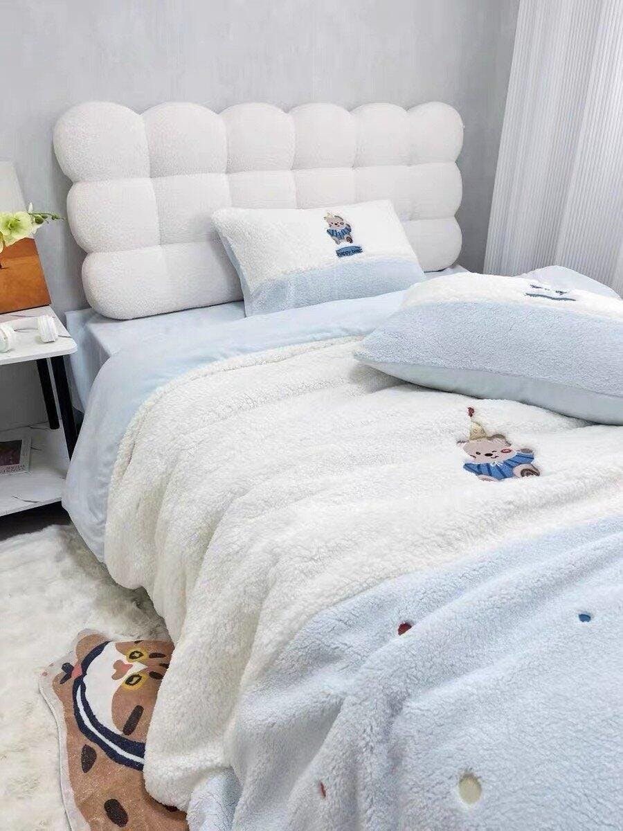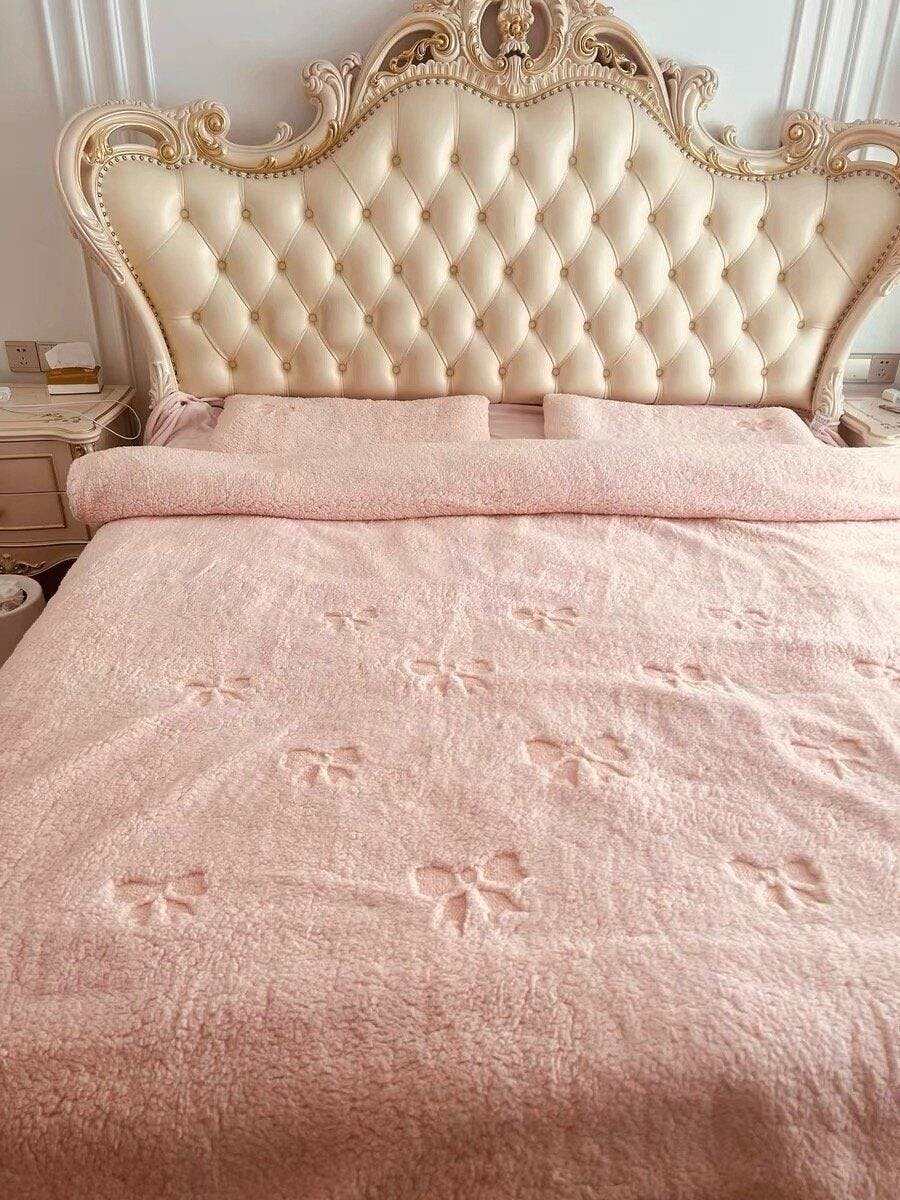 Plush sherpa bedding set with an all-over bow embroidered pattern. Soft, warm, and available in cream, pastel blue, and blush pink colorways.