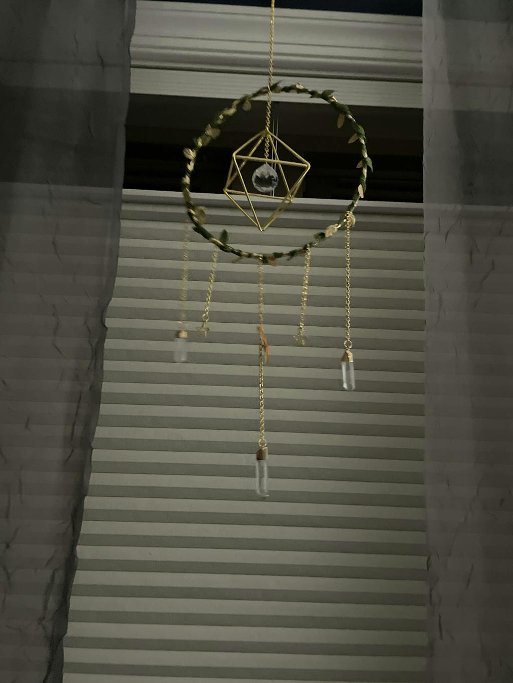 Aesthetic circle shaped suncatcher decorated with artificial leaves, k9 glass crystals and cute pendants. Hang this beauty in a well sunlit area near the window and enjoy your room filled with fairy lights!