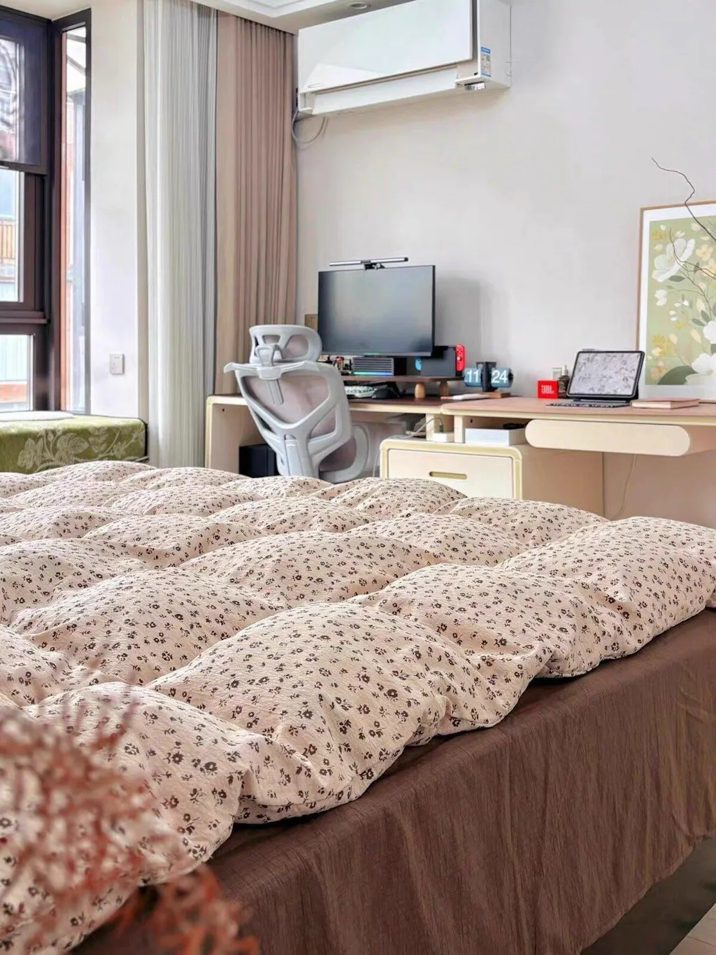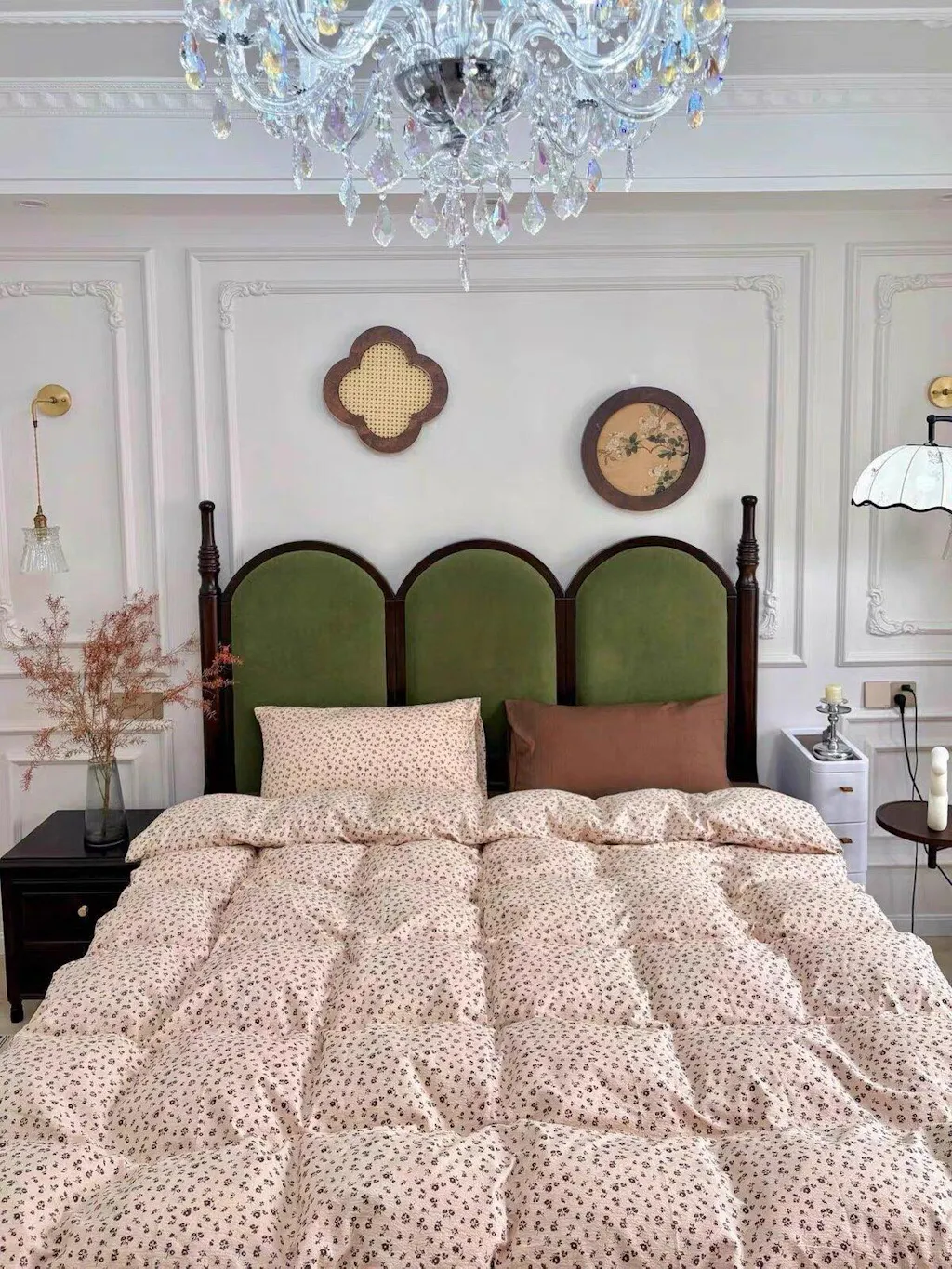 Brown floral bedding set, designed with delicate ivory micro-flowers scattered across a warm chocolate base. The fabric has a lightly crinkled texture that adds depth and a relaxed drape, while the muted tones pair easily with neutral or cream interiors. This set balances vintage charm with everyday practicality. Ideal for layering with textured throws or mixing with lighter floral accents for a cozy, curated bed setup.