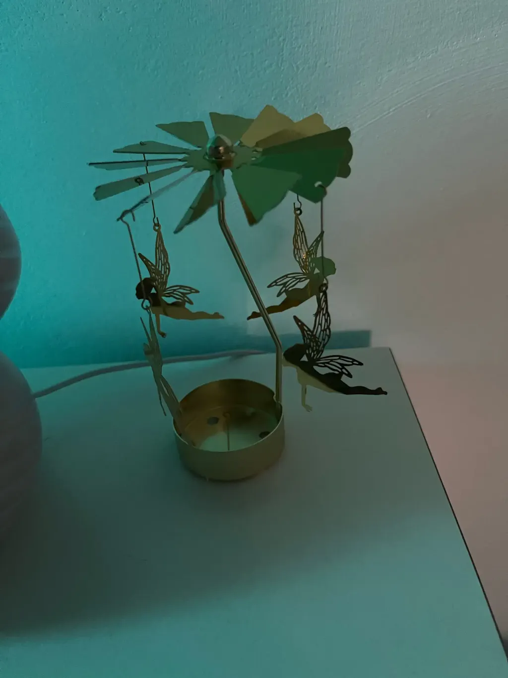 Bright golden carousel tealight candle holder with cute rotating pendants. The heat of the candle will make the pendant and the carousel spin. Turn the lights off and the pendant will dance with the light throwing golden glints on the walls.