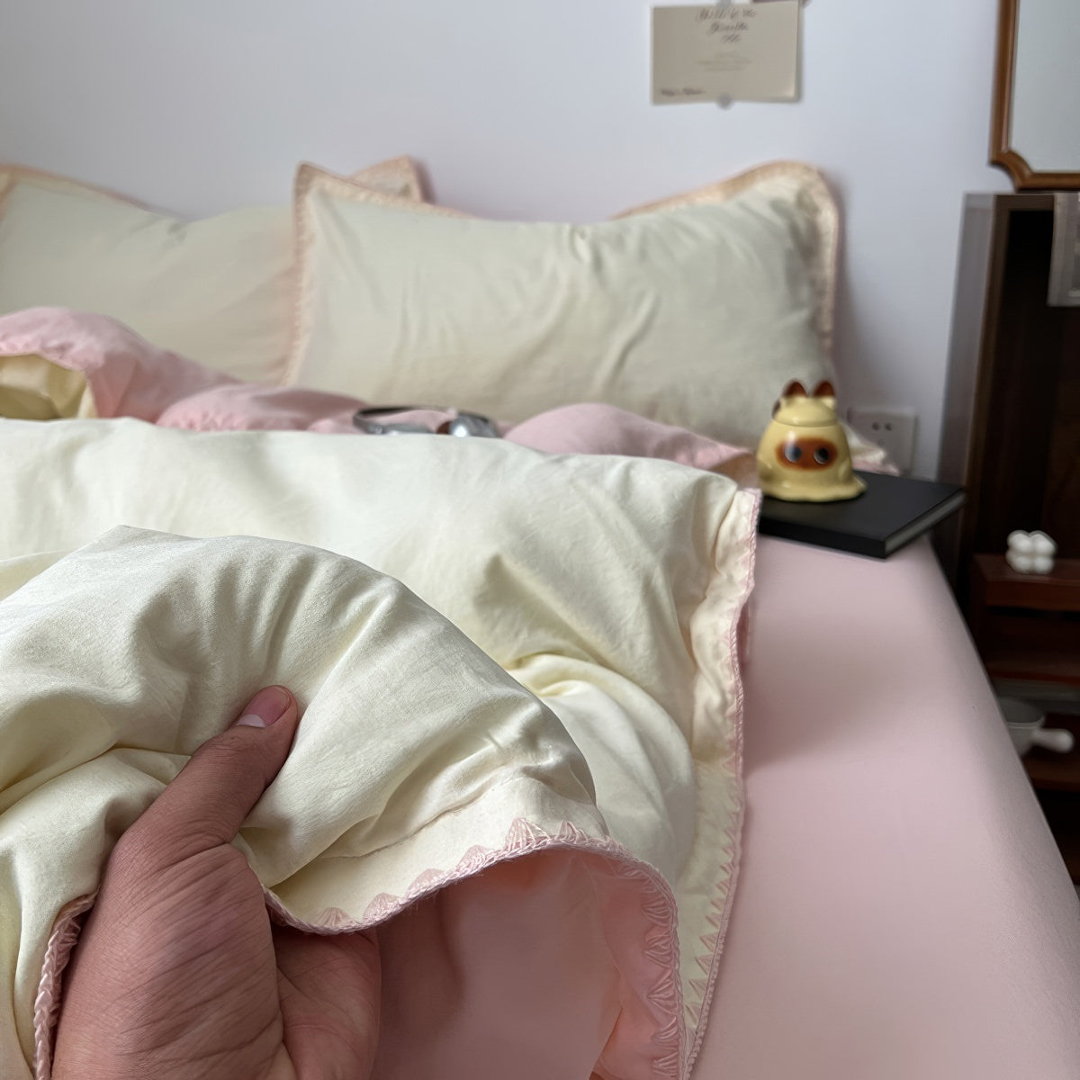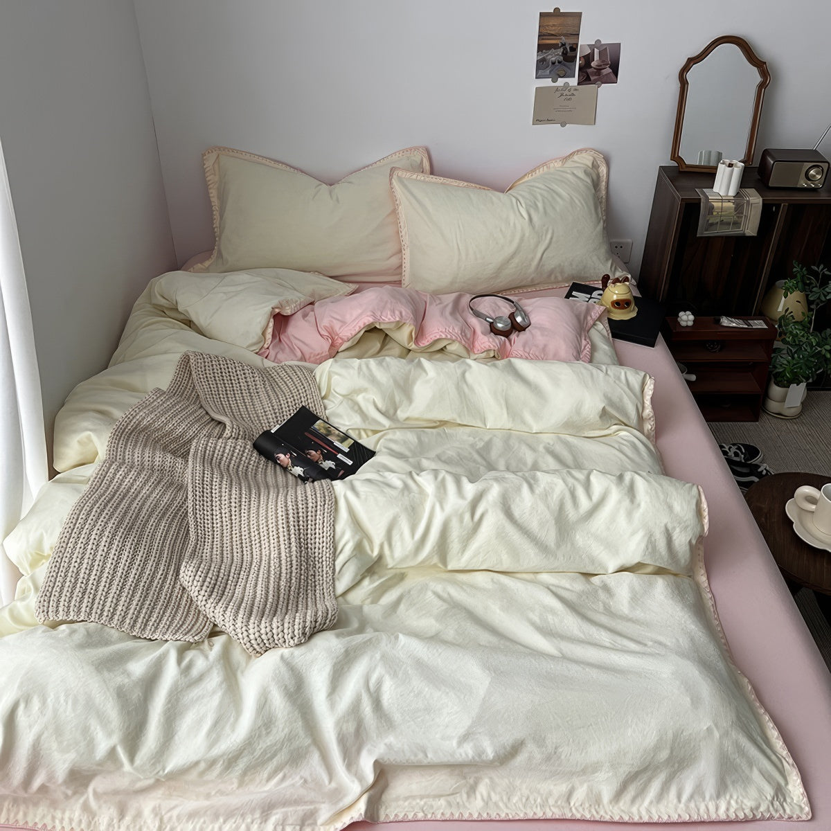 Create a dreamy, soft vibe in your room with this pastel reversible bedding set. Featuring a buttery cream front and a delicate baby pink reverse, this duvet cover set is finished with a subtle stitched edge detail that adds a charming touch. Its plush material promises ultimate comfort for lounging or sleeping, while the gentle color palette brings calm and elegance to any bedroom.