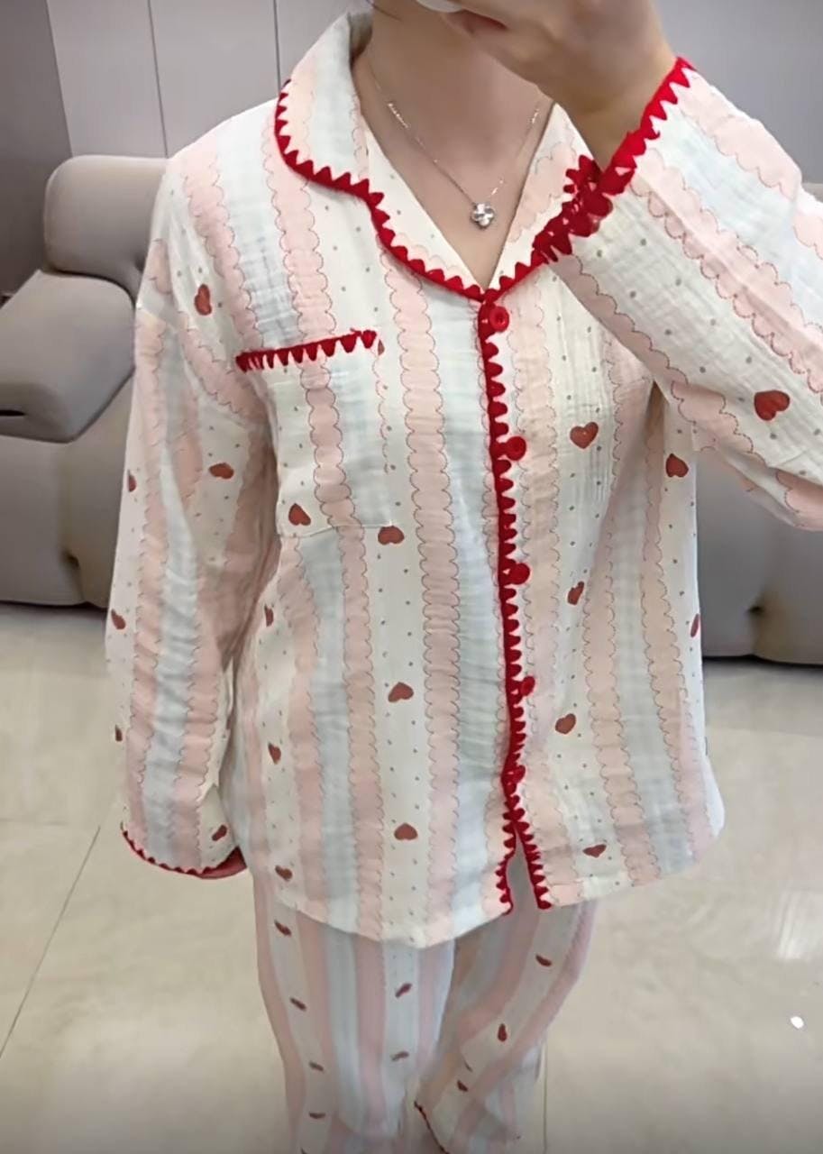 Long-sleeve pajama set, crafted from soft, breathable cotton. Red-stitched edge and red hearts print.