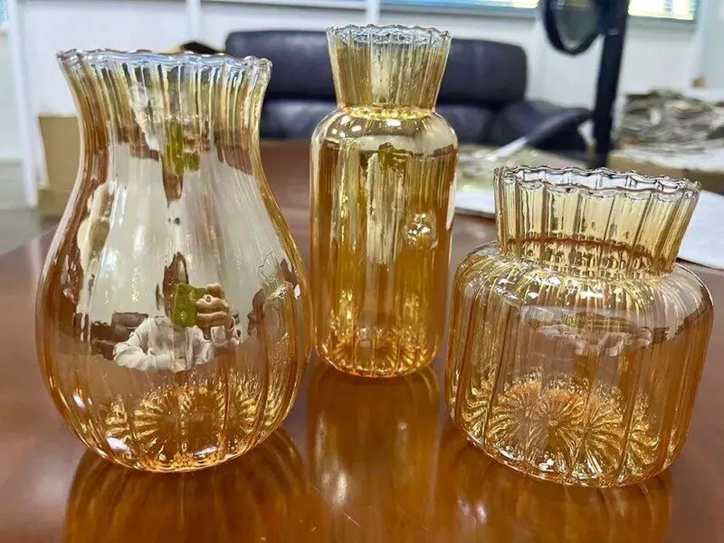 This is a set of amber-toned glass vases and a matching candle holder with a ribbed texture and a fluted rim. The glass is translucent and reflective, giving a delicate and vintage-inspired aesthetic. The warm amber hue complements soft floral arrangements will add an elegant touch to minimalist, cottagecore, or romantic decor styles.