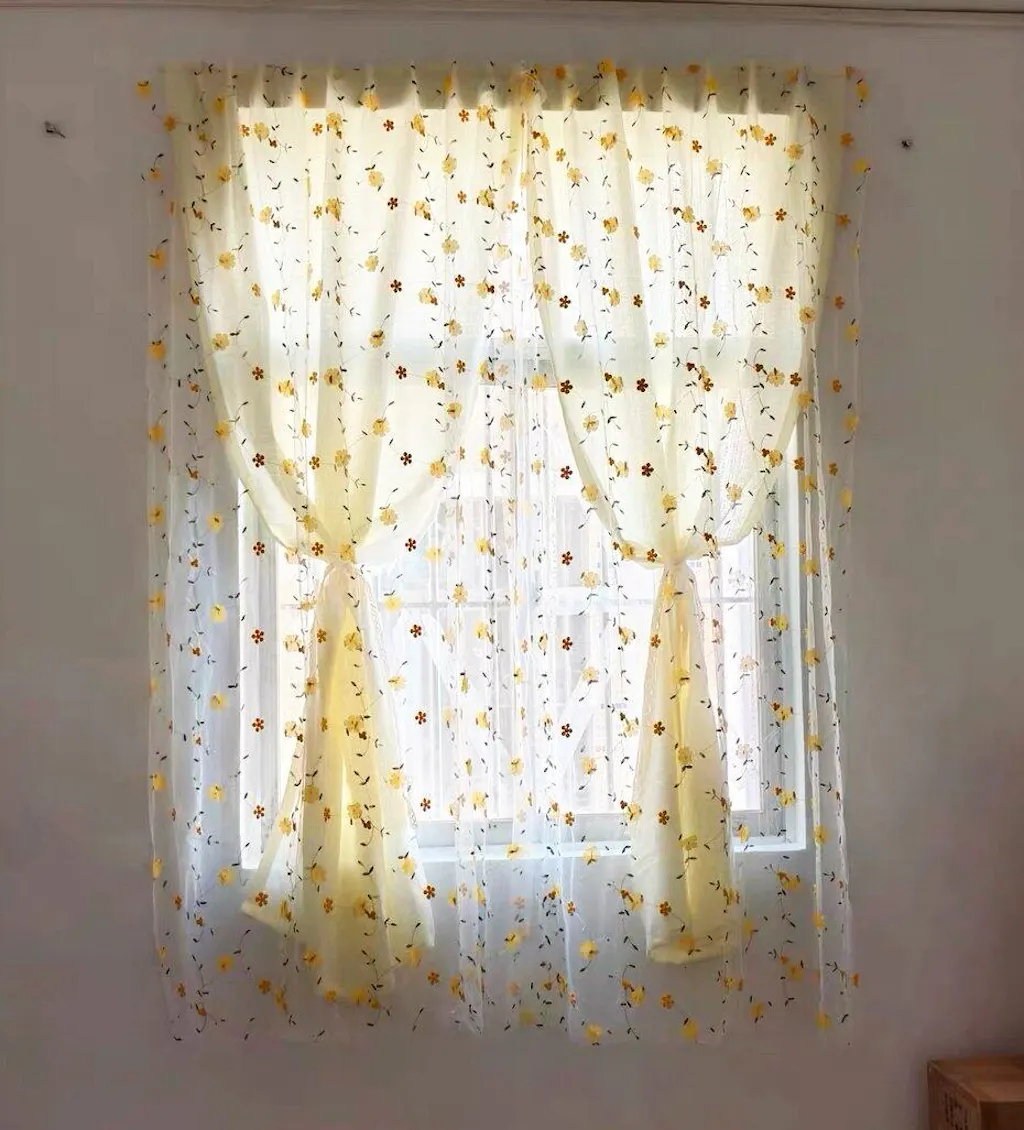 Bring a breath of fresh air to your space with this delicately embroidered sheer curtain panel. Set against a soft milk-white mesh, dainty yellow blossoms dance across the fabric with fine green vine detailing for a breezy, sunlit effect. The semi-sheer double-layered design softly filters light while maintaining privacy, making it ideal for kitchens, reading corners, or anywhere you crave a gentle glow. With rod pocket, hook, and Velcro mounting styles available, it’s as versatile as it is charming.